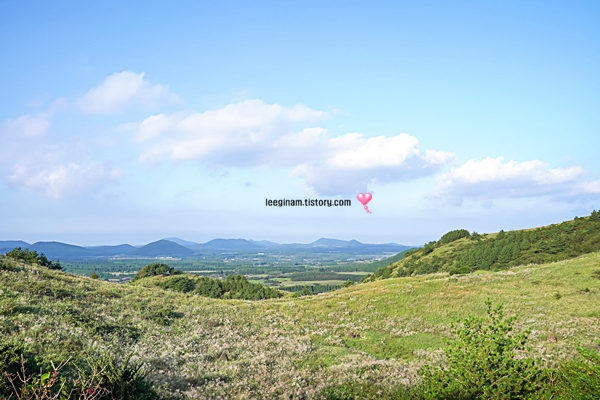 정상에서는 제주도의 동쪽 해안선과 한라산을 포함한 주변 경치를 한눈에 조망할 수 있습니다. 맑은 날에는 특히 아름다운 경치를 감상할 수 있습니다.